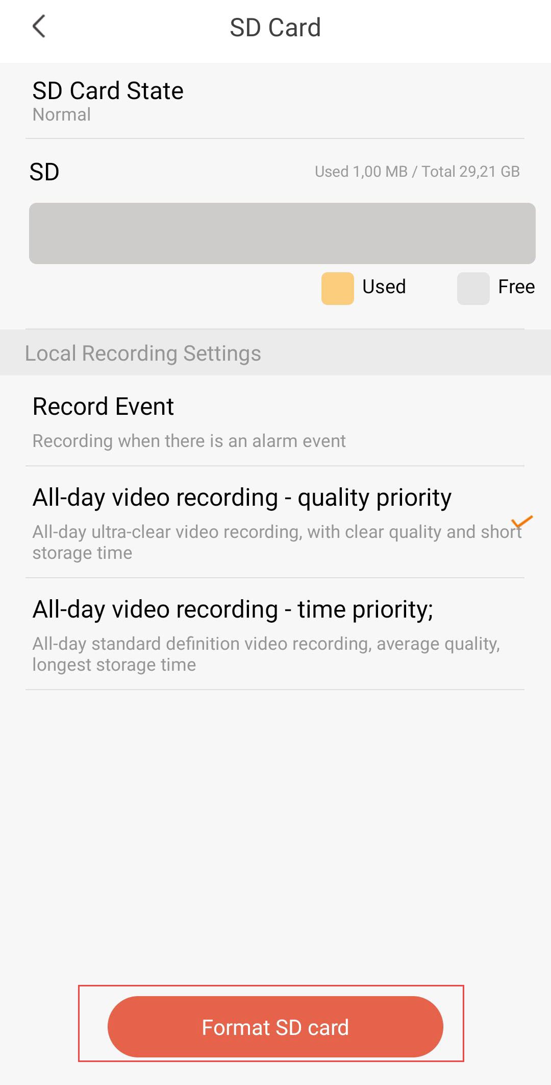- All-Registrazione video giornaliera - Priorità alla qualità: Registrazione continua in qualità ultraclear. Offre la migliore qualità d'immagine, ma la memoria si riempie rapidamente a causa delle maggiori dimensioni dei file.
